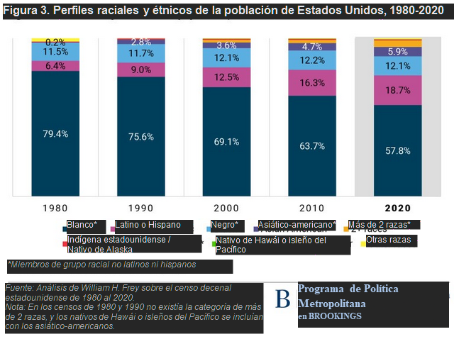 La siguiente imagen muestra la composición racial y étnica de los Estados Unidos según los datos recopilados por el censo entre 1980 y 2020.